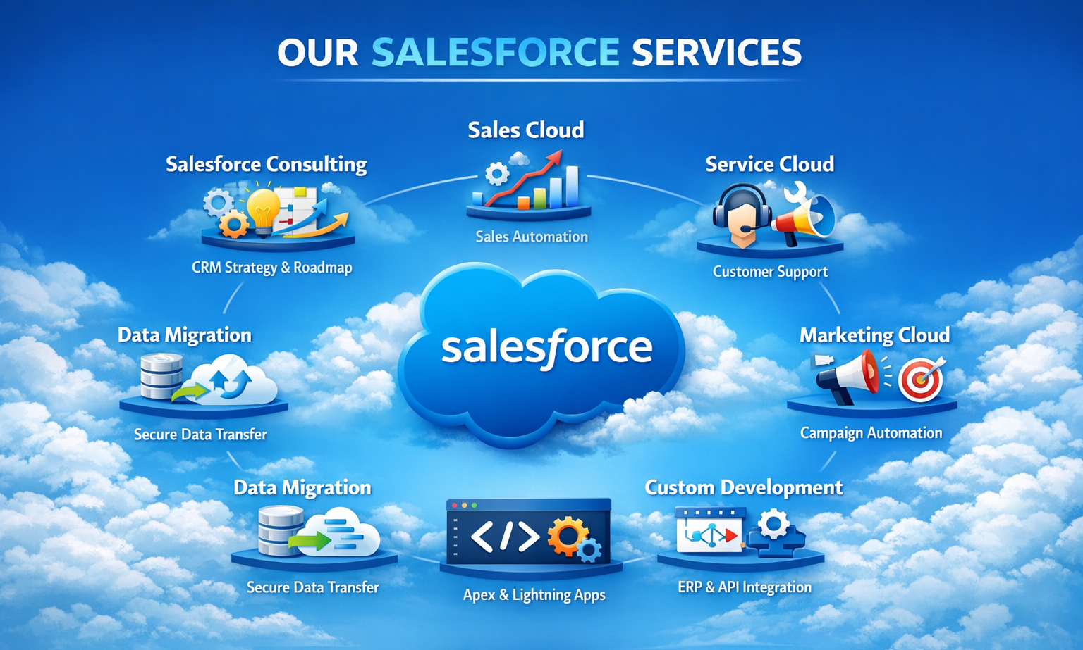 We provide seamless integration of Salesforce with ERP systems, payment gateways, third-party applications, WhatsApp APIs, and enterprise software solutions. Our integration services help organizations create a unified digital ecosystem where customer data flows securely across multiple platforms. This ensures improved operational efficiency and real-time business intelligence.